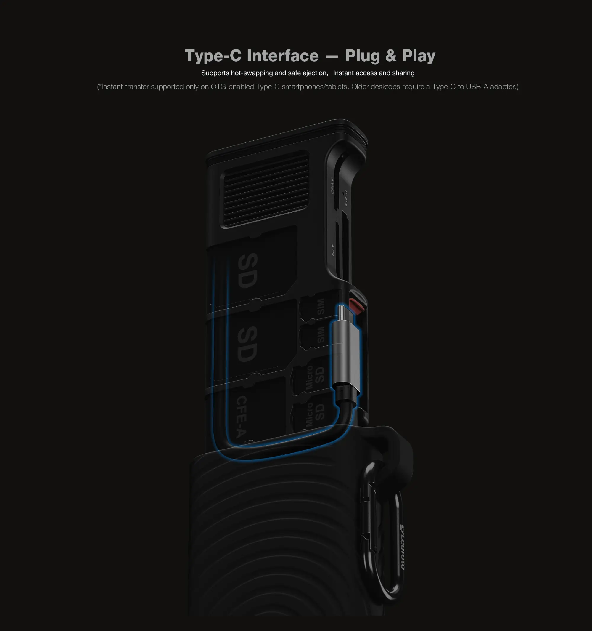 With its USB Type-C interface, the LCR-01 is compatible with modern laptops, tablets, and smartphones. It supports OTG-enabled Type-C devices, offering instant file access, hot-swapping, and safe ejection. For older computers, a Type-C to Type-A adapter can be used for universal compatibility.