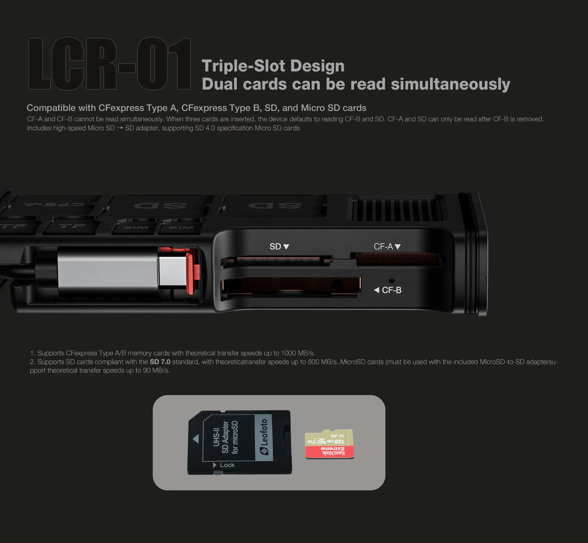 The LCR-01 features a triple-slot system allowing simultaneous dual-card reading for maximum workflow efficiency. CFexpress Type A and Type B cards share independent slots, while an additional SD slot supports both SD and Micro SD formats.