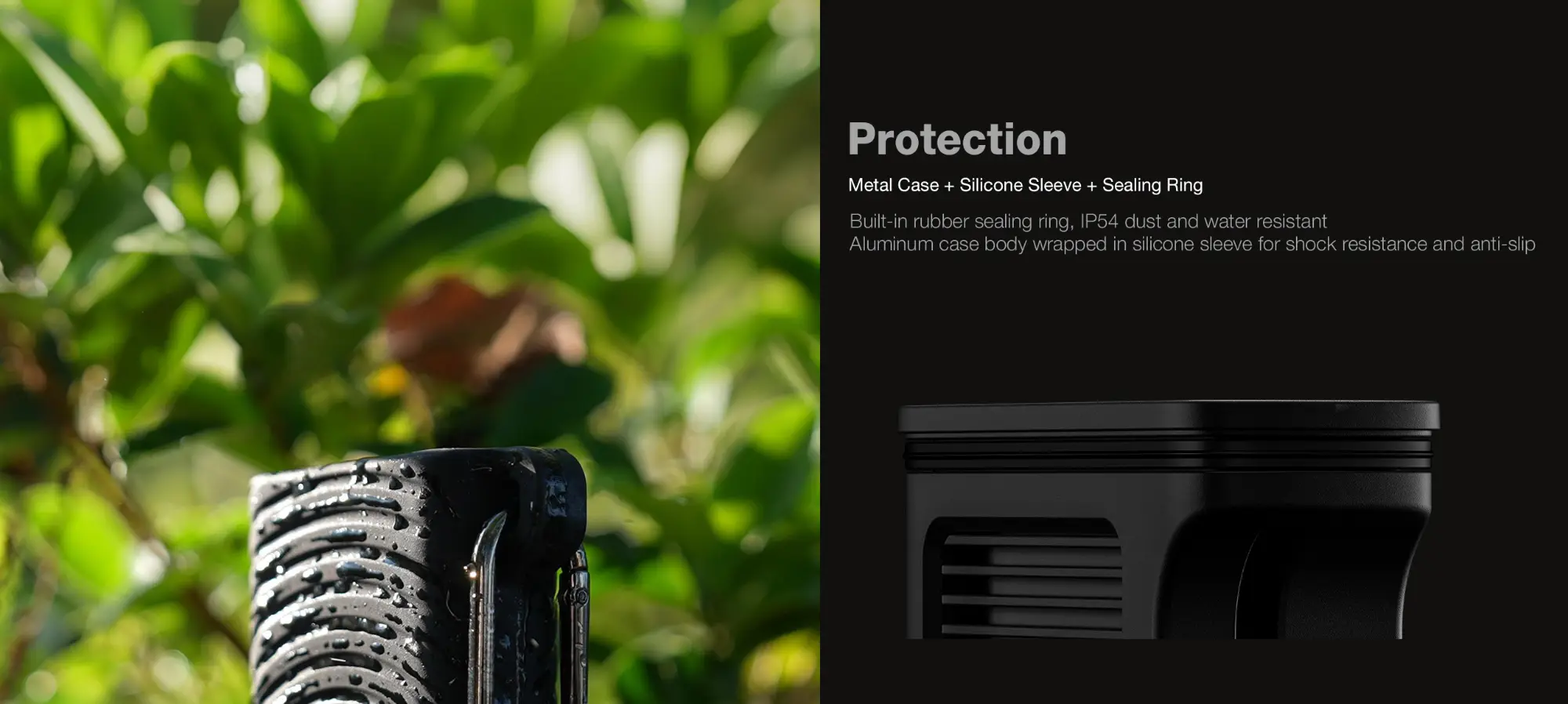 - IP54 dust and splash resistance with built-in sealing ring