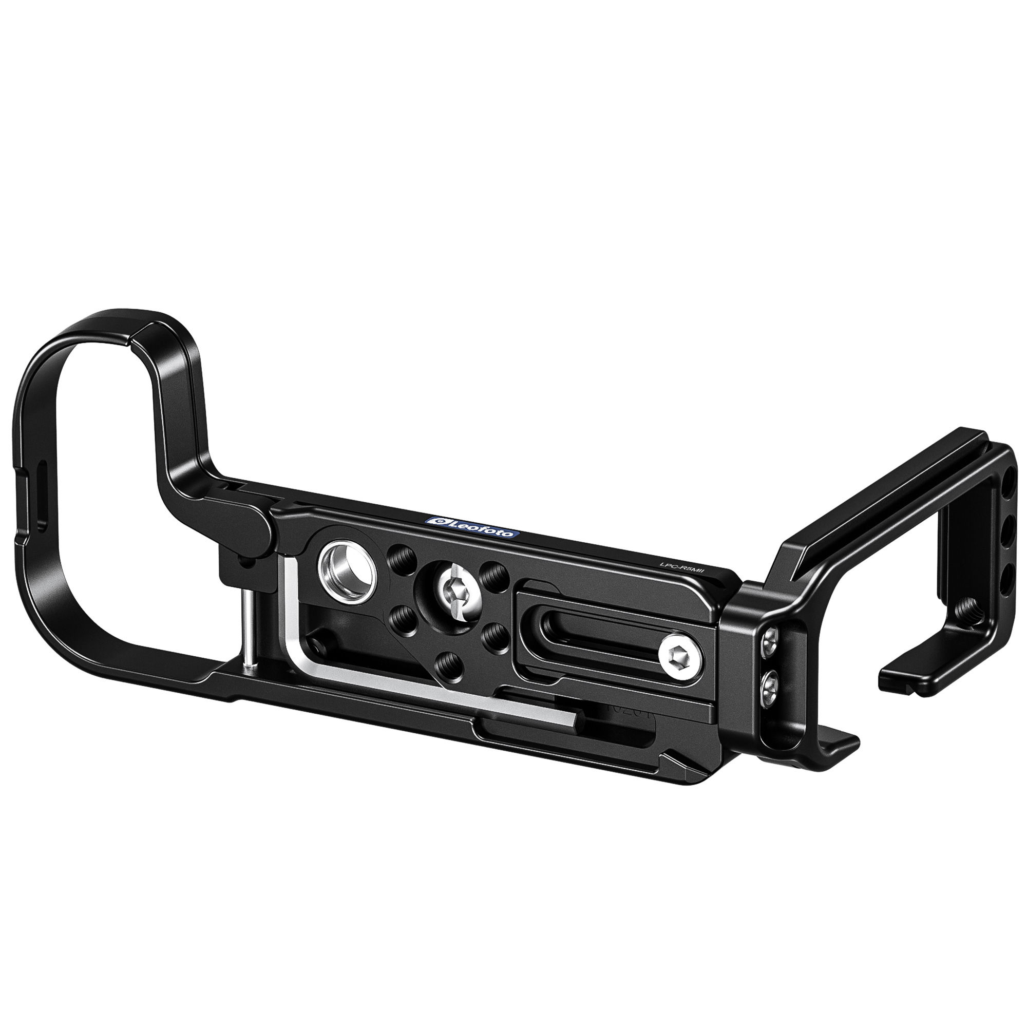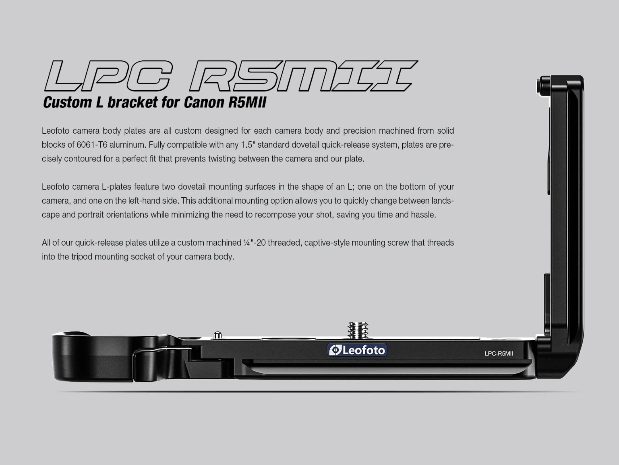 The Leofoto LPC-R5II is a custom-designed L-bracket, precision machined to fit the Canon R5 Mark II camera perfectly. Constructed from high-quality 6061-T6 aluminum, this L-bracket provides a robust and reliable solution for secure camera mounting while allowing photographers to switch between landscape and portrait orientations seamlessly.