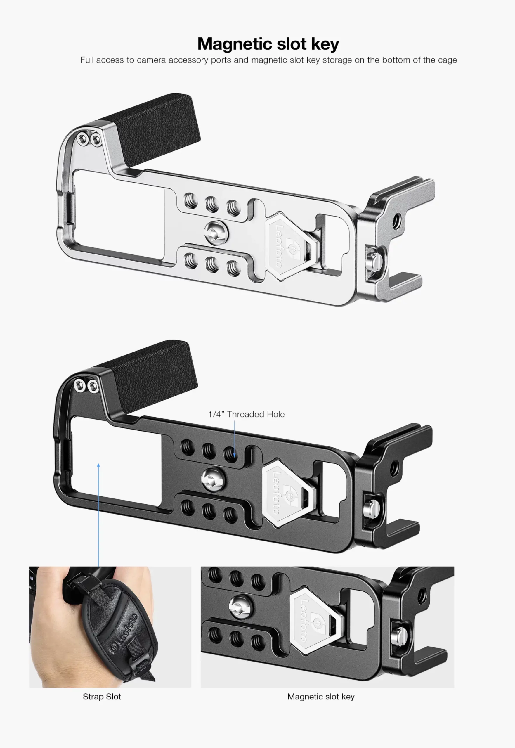 - Multiple 1/4”-20 threaded holes and strap slot for attaching accessories