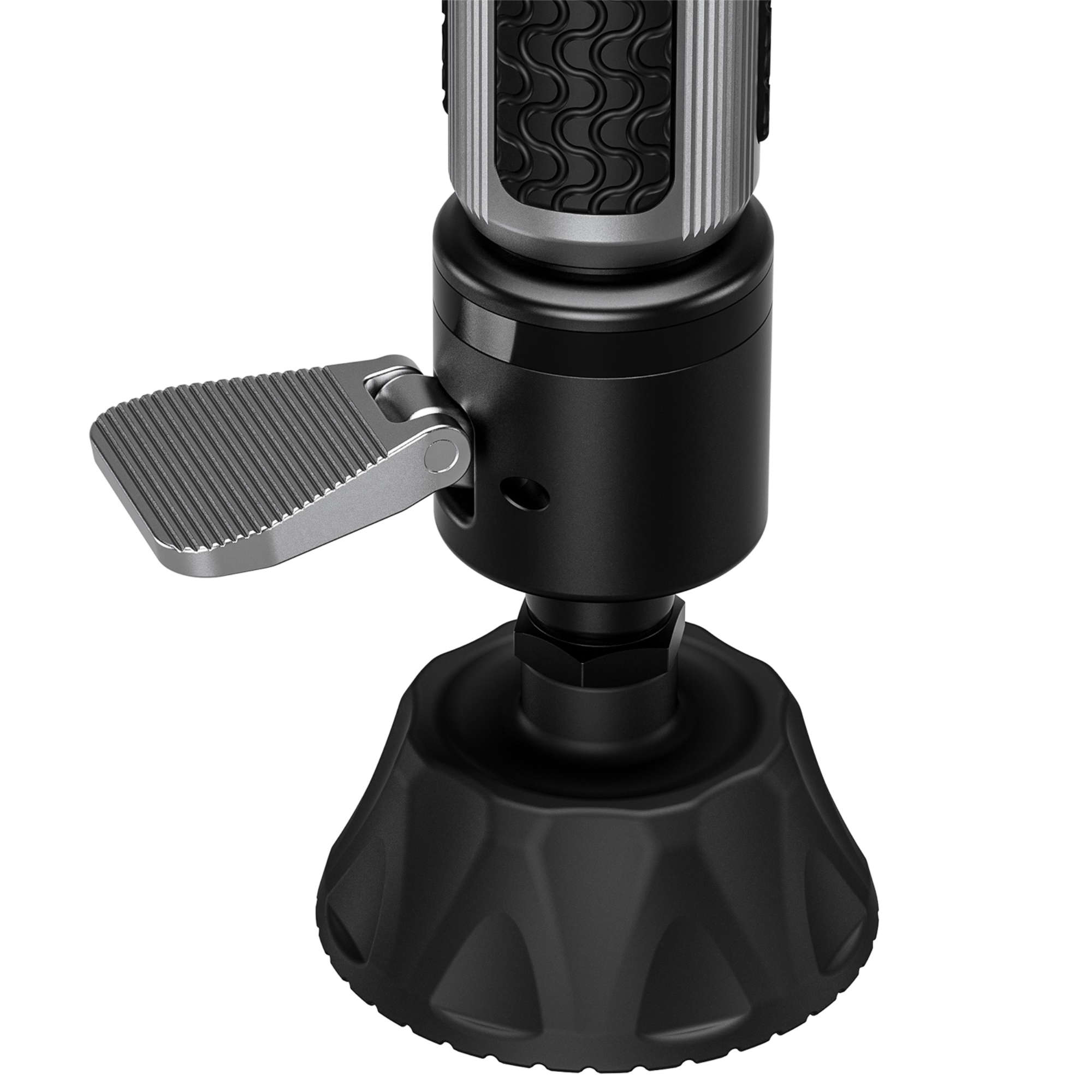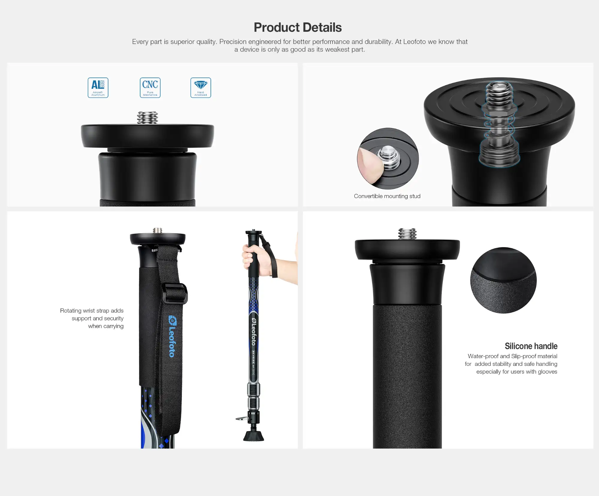 A silicone rubber grip provides a secure, slip-resistant hold, even when wearing gloves or working in wet conditions. The included rotating wrist strap adds safety and comfort when carrying or repositioning the monopod between shots.