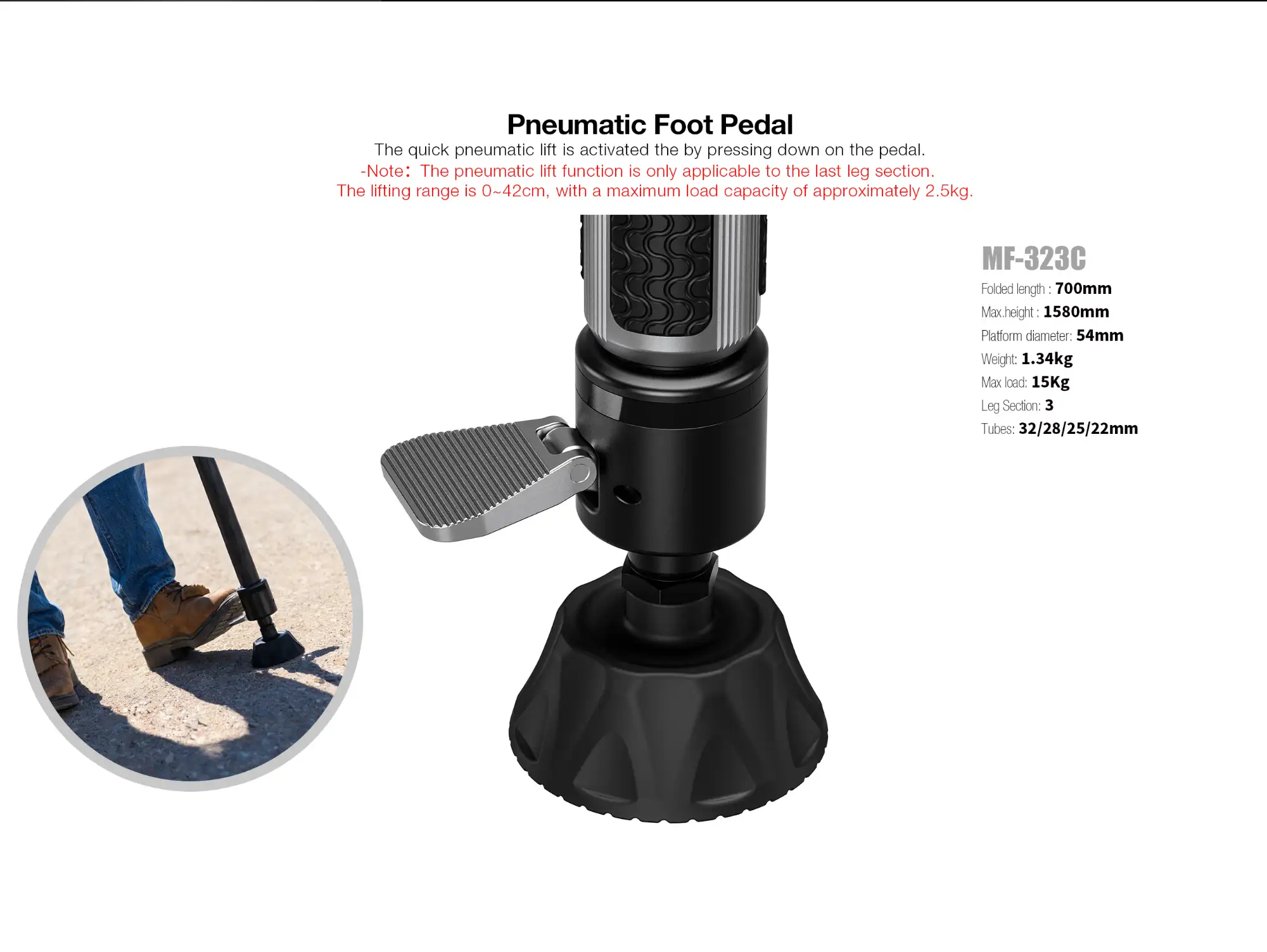 The pneumatic lift applies only to the final leg section, with a lift range of 0–42cm and a maximum supported load of approximately 2.5kg for the pneumatic mechanism itself. The monopod’s overall load capacity remains far higher (see below).