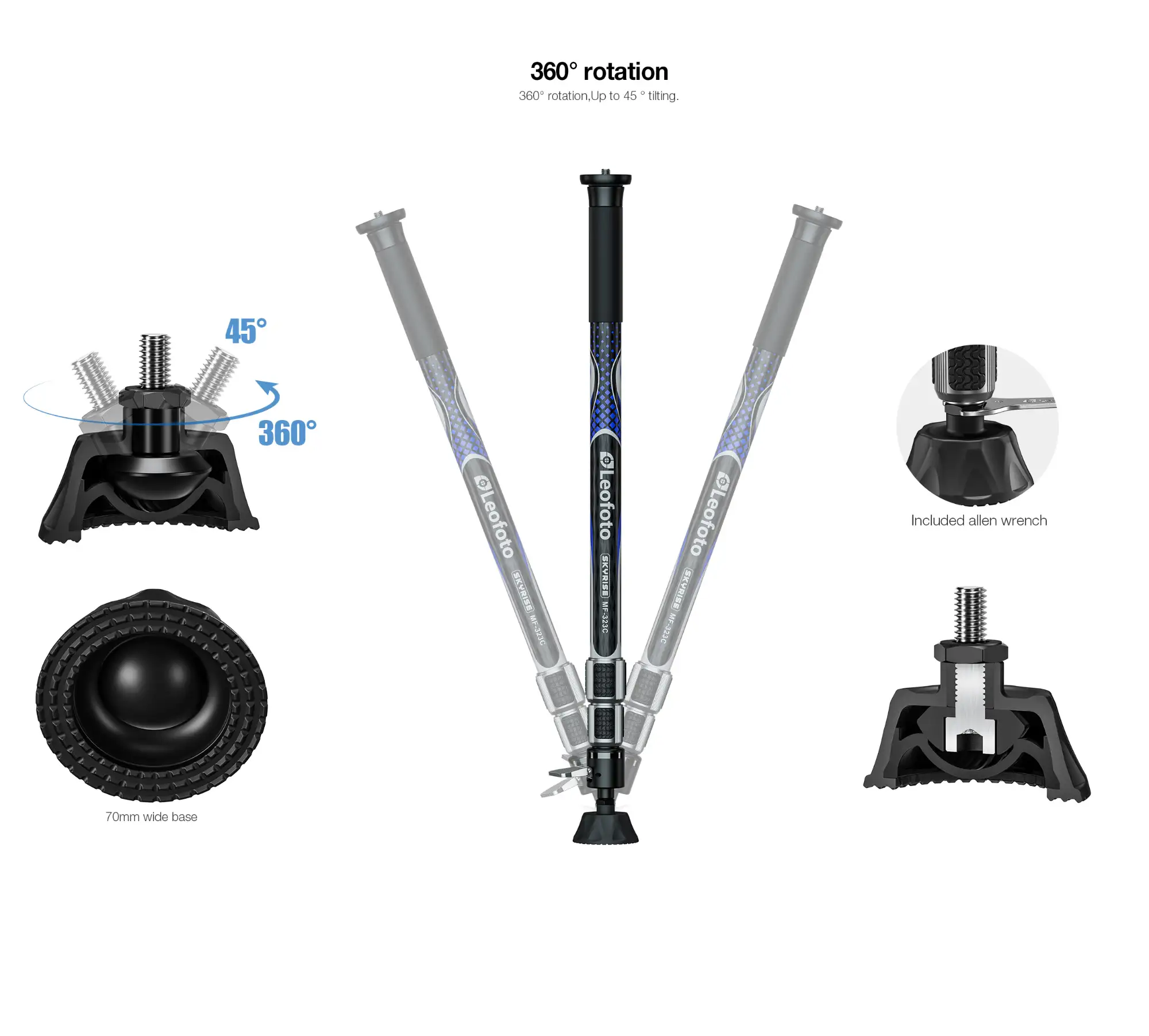 - Wide 70mm base with smooth 360° rotation and up to 45° tilt