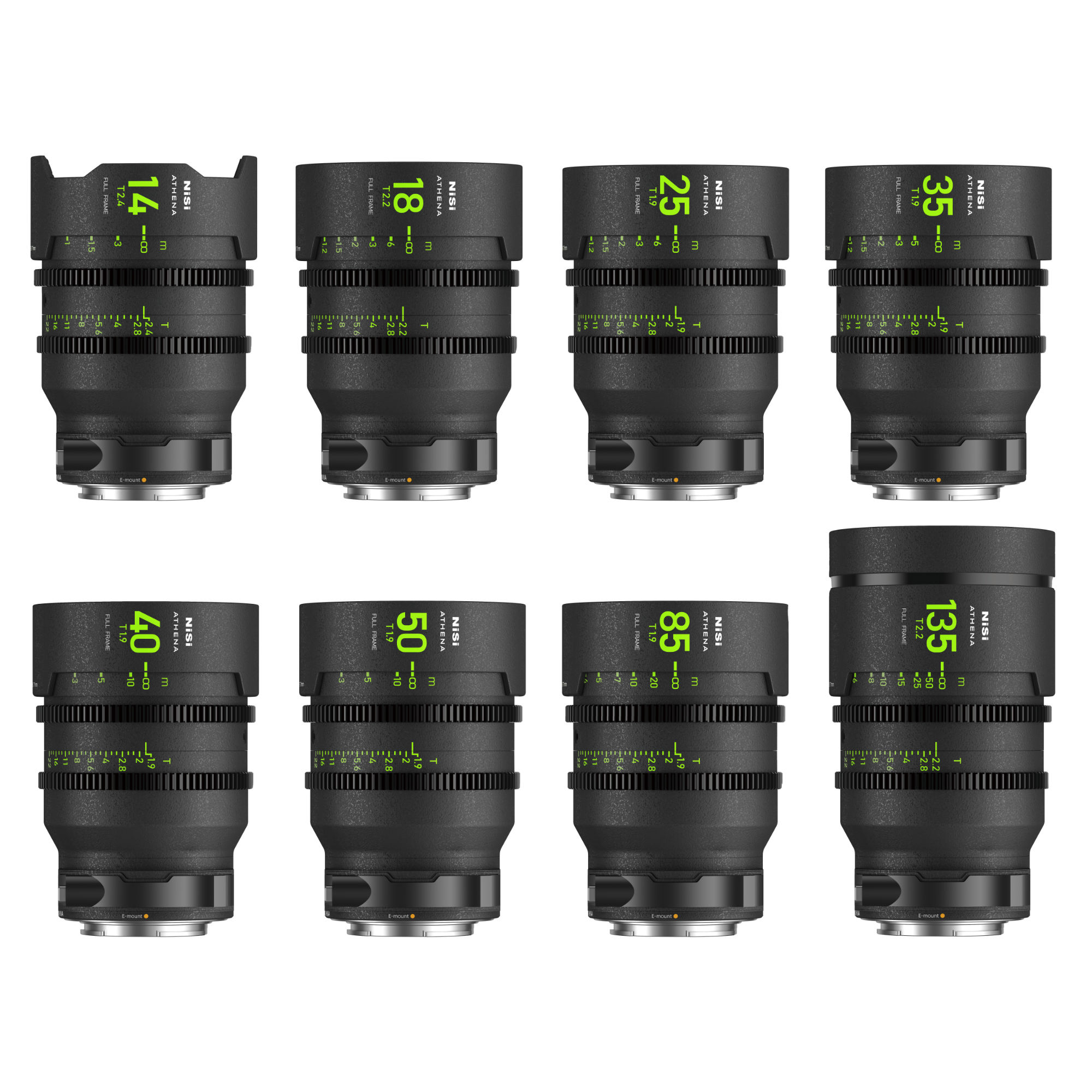 Introducing the NiSi ATHENA PRIME Full Frame Cinema Lens MASTER Kit with 8 Lenses (14mm T2.4, 18mm T2.2, 25mm T1.9, 35mm T1.9, 40mm T1.9, 50mm T1.9, 85mm T1.9, 135mm T2.2) + Hard Case (E Mount), an unparalleled collection of cinema lenses designed for full-frame coverage and beyond, with a 46mm imaging circle to accommodate a wide range of shooting requirements, from expansive landscapes to detailed portraits.