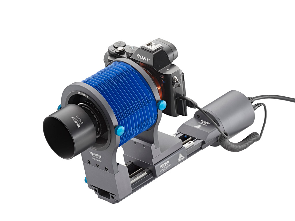 It can be used with any of the adaptors front or rear for the BALPRO bellows system. It is ideal for quality product photography where focus stacking is required.