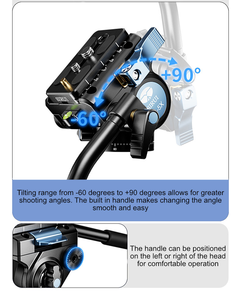 Large Tilting Range: The Sirui VA-5X offers an impressive tilting range, giving videographers the flexibility to achieve a wide variety of angles and perspectives. This large range of motion is perfect for creative shots, from high-angle views to low-ground perspectives, enhancing the storytelling capabilities of your videos. The ability to tilt smoothly and precisely means that even the most challenging angles can be tackled with confidence.