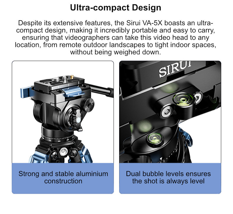 Ultra-compact Design: Despite its extensive features, the Sirui VA-5X boasts an ultra-compact design, making it incredibly portable and easy to carry. This compactness does not compromise on stability or performance, ensuring that videographers can take this video head to any location, from remote outdoor landscapes to tight indoor spaces, without being weighed down.